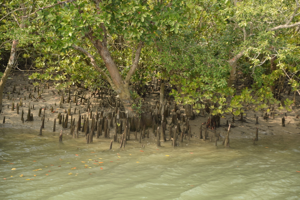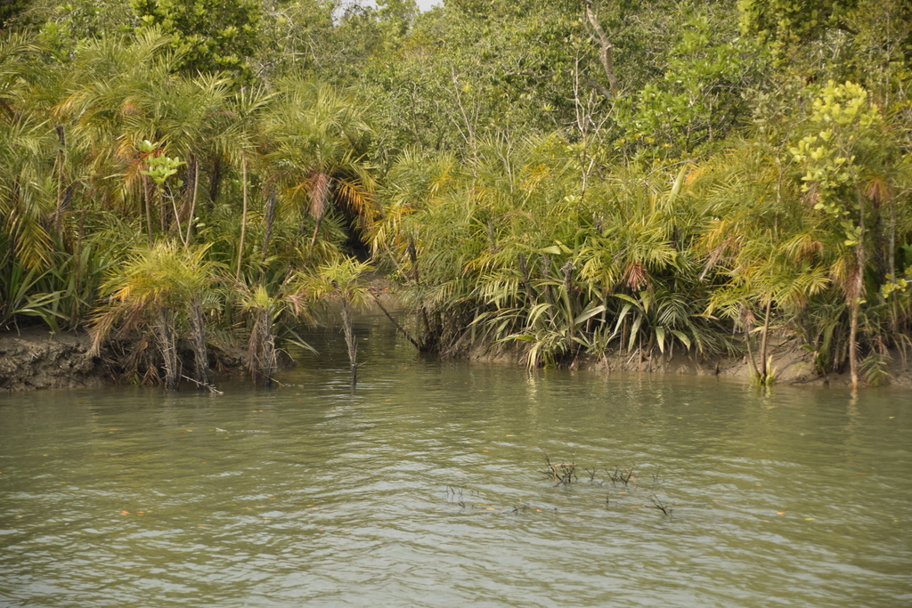 Wildlife Moments: Deer walking along muddy banks, monkeys jumping on trees, crocodiles showing their heads, and the silent presence of the Royal Bengal Tiger hiding in the bushes.