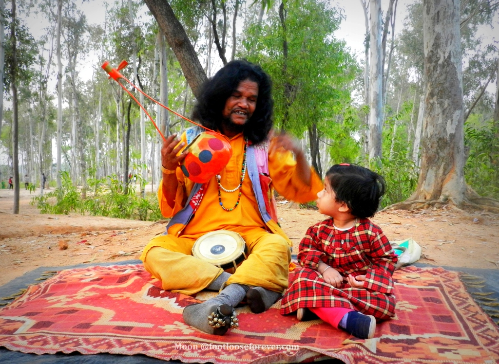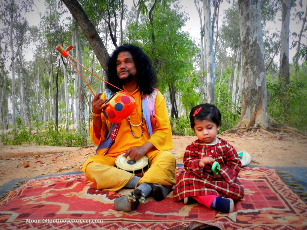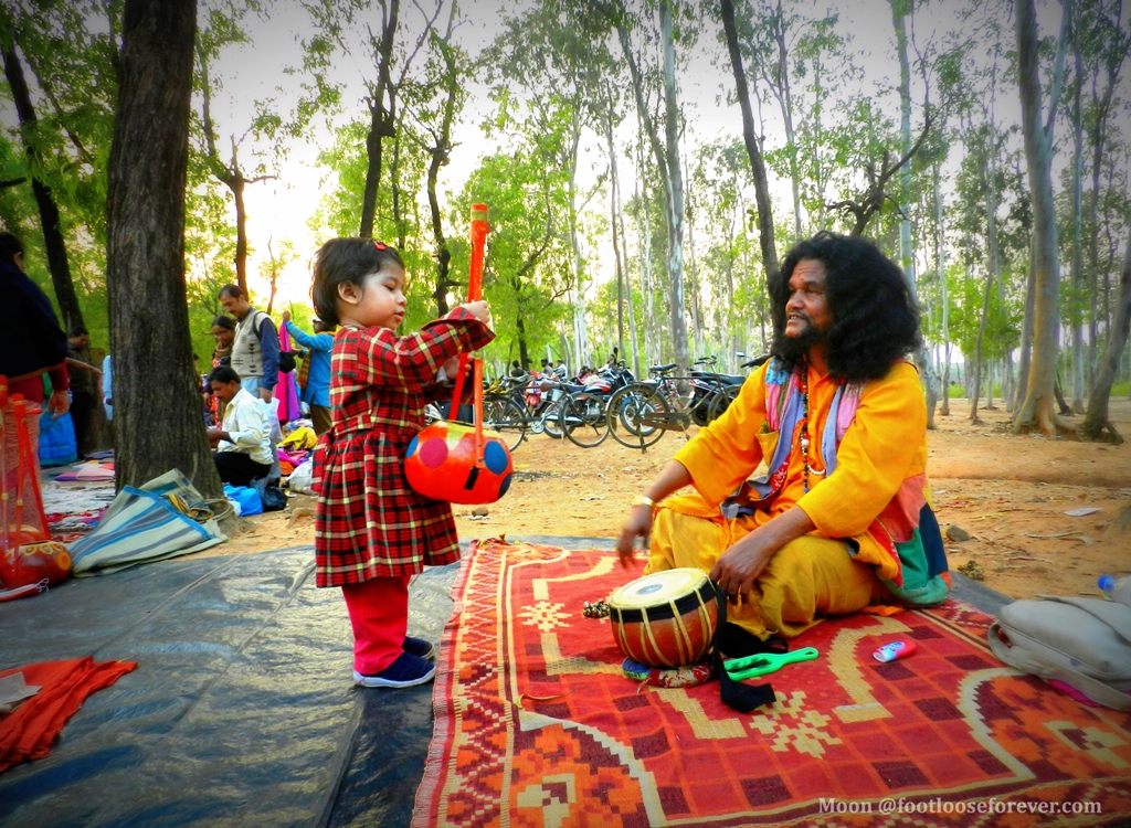Shanibarer Haat (Saturday Market) by the Sonajhuri Forest is an event not to be missed at Shantiniketan. The market is a colorful, vibrant place to feel the heartbeat of life in Bolpur-Shantiniketan. Last January we made a short weekend trip to Shantiniketan. As I was wandering around in this makeshift market I spotted this ‘little aficionado’ approaching towards the baul sitting underneath a tree. She was curious about the ‘ektara’ (an indigenous single-stringed musical instrument used by local folk singers). I don’t know what she spoke to him, as I couldn’t hear anything from a distance. A moment later they became friends and she started assisting him in his music with a ‘jhunjhuni’.